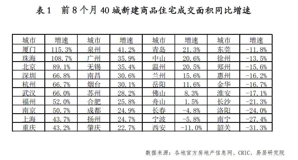 从城市来看,前8个月,40城新建商品住宅成交面积同比增速排名前十的城市依次为:厦门、珠海、北京、深圳、杭州、武汉、福州、南京、上海、重庆。